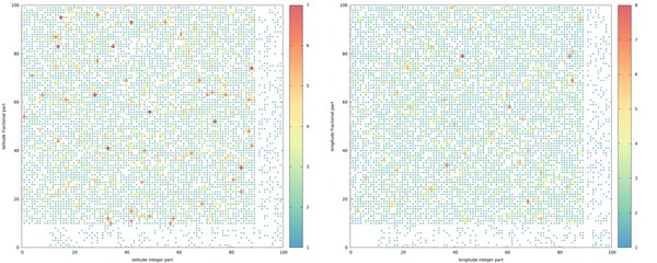 This one completely surprised me. I was looking for the exact spacing being applied to some data and started seeing all kinds of interesting stuff in the high-frequency range: spikes at 217 and 218 indicating single-precision truncation, powers of ten indicating digit truncation, and in another (not yet published) analysis, 1/60 and 1/3600 from truncated DMS encoding.